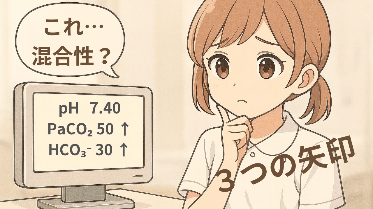 pH・PaCO₂・HCO₃⁻ の「3つの矢印(方向性)」をそろえて見ることがポイントです。