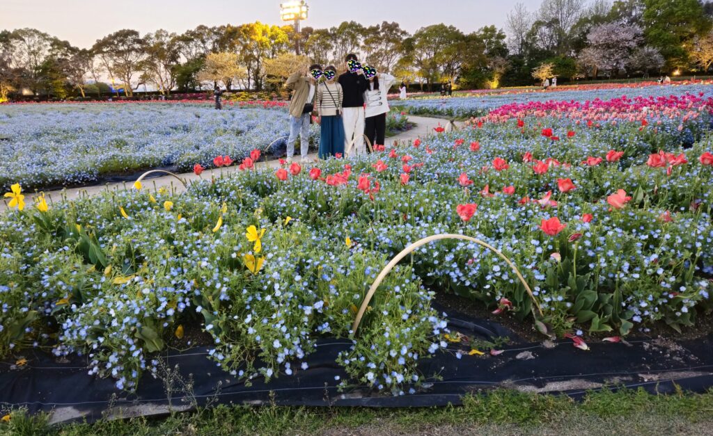 チューリップ畑からネモフィラ畑へと移り変わる